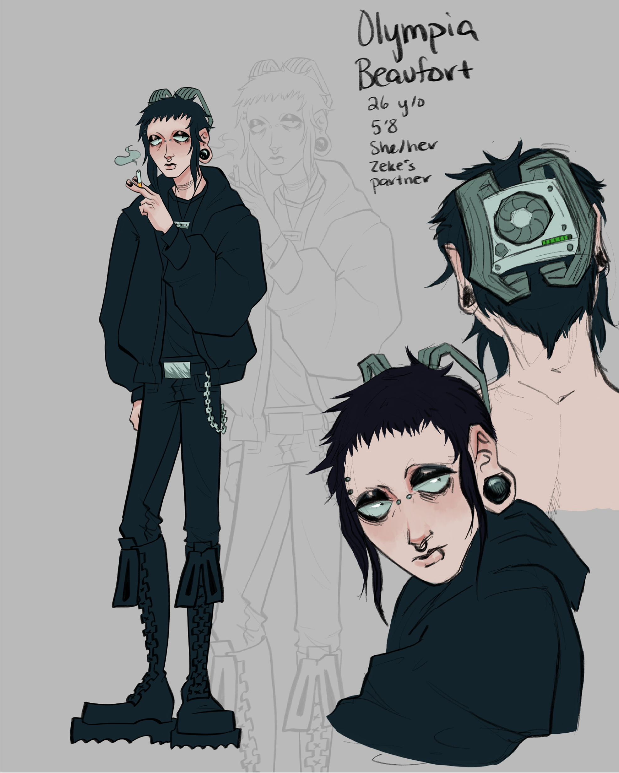 Olympia is a cold, blunt, and apathetic canary (someone who sells private information) who is trying to keep her family afloat. She risked her life to fuse her brain with a computer, enabling her to navigate the cyberspace at high speeds and provide medicine for her sick father. Although she is a cyborg, she is the heart of the story. She cares and feels deeply for others, trying her best to help those in need.