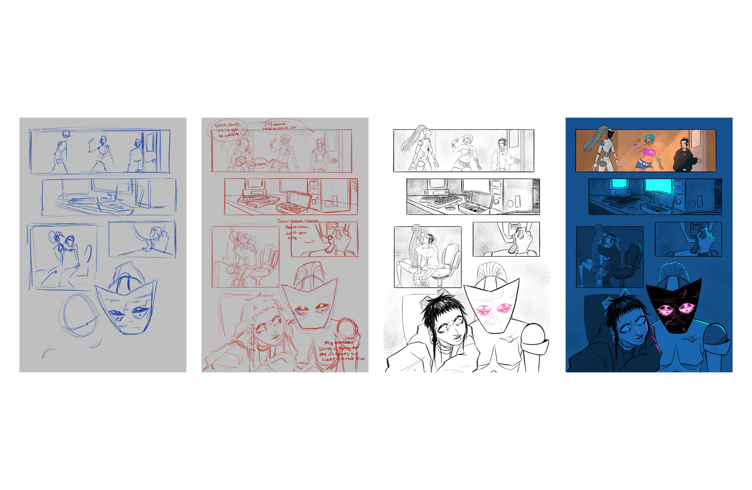 Degenerate Justice is a thesis project focused on creating the first issue of a sci-fi comic book series. Set in a dystopian future in which all crime is legal, the story follows charismatic detective, Zeke, and his cyborg assistant, Olympia, as they search for a missing girl, with only the corrupted memory of an android as their lead. Along the way, they also confront the complexities of their strained relationship.